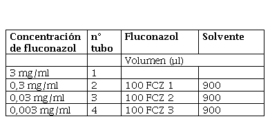 Serie de diluciones del fluconazol. Preparar una solución madre de 3 mg de fluconazol por ml de la mezcla de solventes DMSO/agua destilada (1+ 5) volúmenes. A partir de ellas se preparan 3 soluciones hijas por dilución 1/10 v/v en el mismo solvente mixto. Rotular los tubos resultantes como 1, 2, 3 y 4 (ver Tabla 1 y Figura 4).