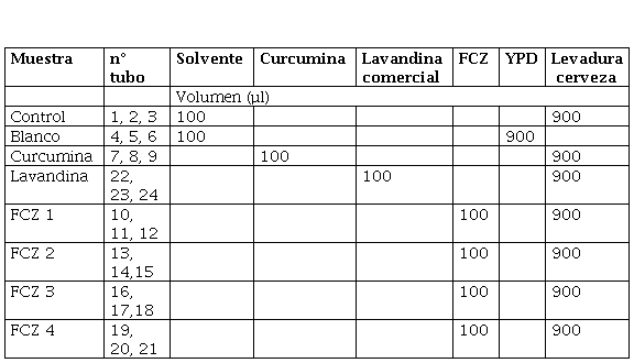 Incubación de levaduras con curcumina, lavandina y fluconazol. Diluir 1/10 v/v con medio YPD y el inóculo obtenido el día anterior. Colocar el inóculo resultante en tubos y agregar los demás preparados según el esquema de la Tabla 2. Luego cultivar los tubos hasta el día siguiente a temperatura ambiente durante 18-22 h.