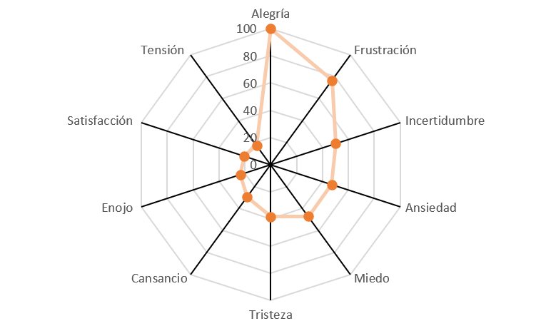 Por otro lado, también emergen los conceptos de Tristeza y Cansancio, con 13 y 10 de VMT y porcentajes del 38 % y 29 %, respectivamente. Finalmente, tres conceptos que registran valores FMG entre el 15 % y el 25 %, fueron: Enojo, Satisfacción y Tensión.