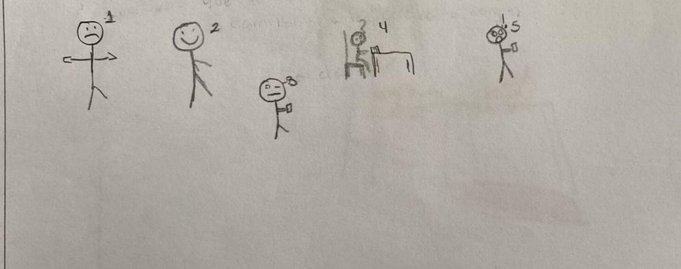 1. no sabe qué hacer. 2. caminando hacia la cocina por comida. 3. en clases semi despierta. 4. no saber hacer la tarea. 5. le preguntan y no sabe la respuesta (le da miedo decir que no sabe o simplemente no quiere responder por vergüenza y/o miedo). (Ver Figura 7).