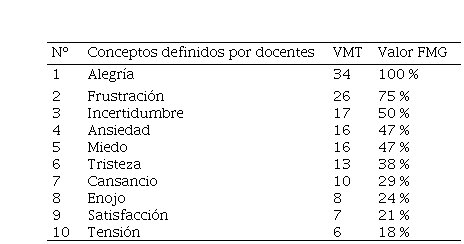 Frente a la pregunta para el cuerpo docente: ¿Qué emociones ha sentido en clases virtuales en el actual contexto de pandemia? Se destaca la Tabla 1 y Figura 1 que detallan el conjunto SAM, referido a los 10 conceptos que obtuvieron las más altas frecuencias (núcleo conceptual figurativo de significado) y la distancia semántica entre cada una de las palabras declaradas (VMT y FMG).