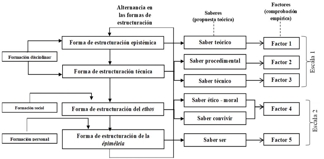 En la Figura 1 se muestra la congruencia entre la teoría y los factores arrojados por la comprobación empírica de la aplicación del cuestionario, así como la relación de alternancia que se debe dar entre los distintos saberes de las formas de estructuración disposicional en la formación del estudiantado universitario.