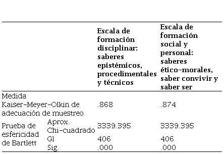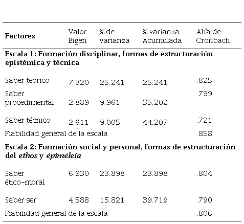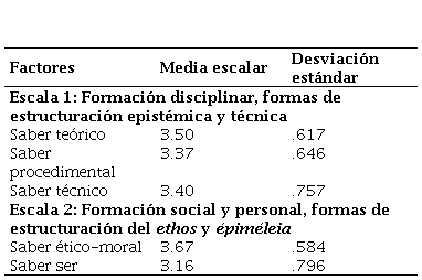 La estructura factorial de la escala diseñada fue similar a la hipotetizada teóricamente y sustentada por la planteada en las formas de estructuración de los sistemas disposicionales que constituyen a los saberes en la formación de estudiantes de nivel universitario propuestos por Yurén et al. (2005), por lo tanto, se comprueba la congruencia entre los factores arrojados por la parte empírica y la teórica.
