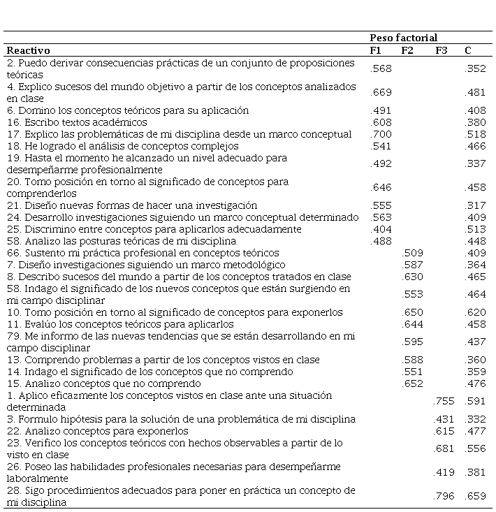 En cuanto a la estructura factorial, la Tabla 3 muestra los resultados obtenidos a partir del análisis factorial exploratorio con rotación varimax para la Escala 1, es decir, el peso factorial por reactivo y las comunalidades de cada uno.