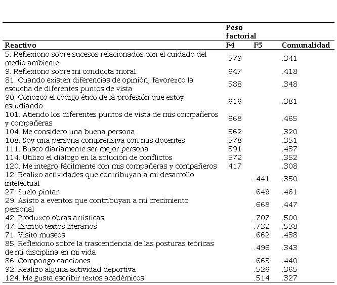 Factor 4. Saber ético-moral y saber convivir . En este factor se agruparon el saber ético-moral y el saber convivir. Si bien, la teoría propuesta los plantea de manera independiente, la comprobación empírica muestra que el estudiantado no discriminó entre estos, dado que ambos se dirigen al modo de relacionarse con las otras personas. El saber ético-moral pone énfasis en el desarrollo de habilidades de escucha, de descentración de perspectivas, empatía, pensamiento crítico, juicio y decisión moral. Se pretende, mediante este saber, que el individuo avance hacia una moralidad del sistema social que se ubica en el ejercicio de la autonomía, el respeto y la protección de los derechos humanos; así como en desarrollo de modelos de equidad, bienestar social y la apropiación de principios éticos (Delgado et al. 2005). Mientras que el saber convivir es el saber cuya base se encuentra en las actitudes personales e interpersonales que facilitan las relaciones, convivencia y el trabajo con las demás personas (García et al. 2009). Ambos saberes implican una acción dirigida hacia la otredad, la cual debe ser permeada por la toma de decisiones morales. Aunque los dos factores se agruparon en uno solo, no se rechaza en torno al sustento teórico planteado porque ambos saberes permiten desarrollar una convivencia social, en donde el estudiantado se relaciona tanto con sus pares como con su comunidad y su contexto. Son saberes, tal como lo menciona Yurén et al. (2005), que se complementan y relacionan de manera recíproca. Es decir, no puede existir un saber ético-moral sin uno que permita su operatividad a través de la convivencia constante entre los miembros de una sociedad. En este sentido las personas participantes no discriminaron entre ellos porque son complementarios el uno del otro y, por lo tanto, los reactivos se correlacionan de manera estrecha, tanto así que no se distinguen como factores independientes en el Análisis Factorial Exploratorio. Teóricamente, se hace una distinción, tal como lo proponen las autorías, para definirlos conceptualmente; sin embargo, como quedó evidenciado empíricamente, a través de la aplicación que se hizo al estudiantado universitario, ambos son factores formativos vinculados que operativamente no se excluyen.