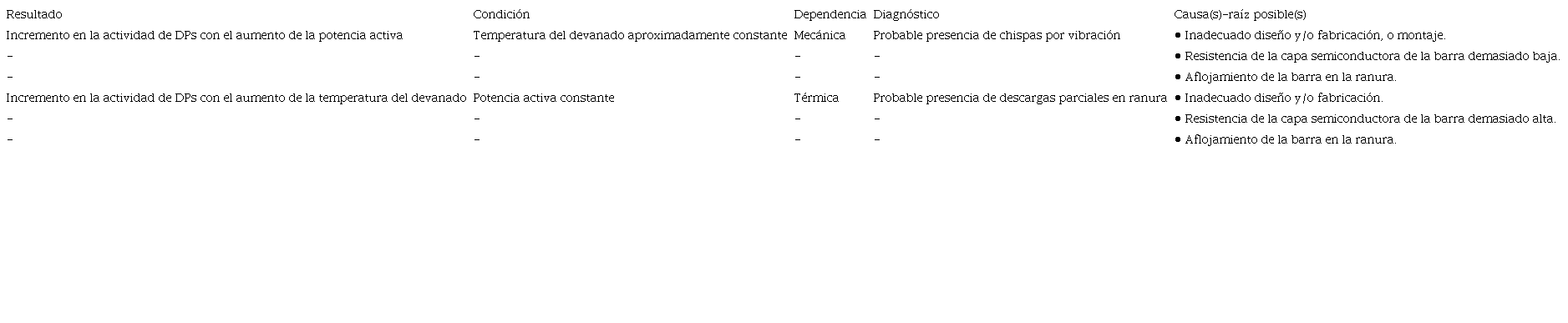 Los resultados de las pruebas se analizan buscando dependencias entre la actividad registrada de DPs en-línea, con el nivel de potencia y la temperatura del devanado de estator. El diagnóstico se realiza siguiendo lo indicado en el CUADRO I.