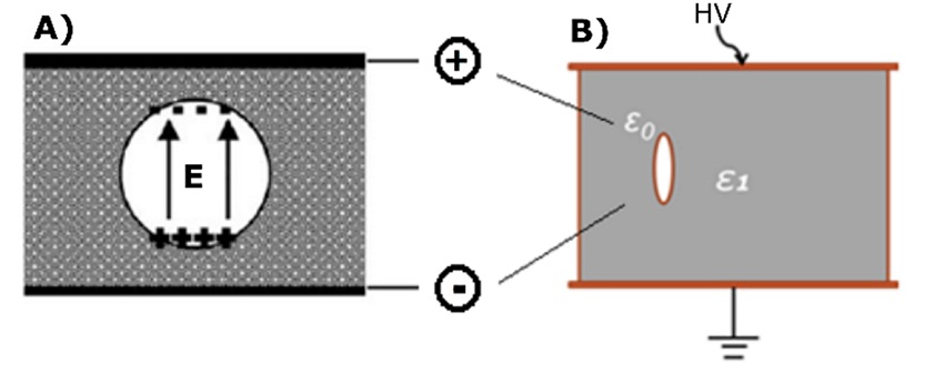 La Fig. 1 explica el fenómeno que sucede en el interior de un material aislante que incluye alguna burbuja de aire. El aislante y el aire pueden ser caracterizados por un parámetro conocido como su permitividad, con la permitividad del aire y la del material aislante, donde se tiene que La permitividad define la tendencia de un material a polarizarse frente a un campo eléctrico E y así anular parcialmente el campo interno [14]. Cuando se aplica la tensión HV (en Fig. 1 B), el campo tiende a concentrarse en la burbuja de aire. Las cargas se acumulan en los extremos (en Fig. 1 A) y una ionización gaseosa transitoria ocurre al exceder el valor crítico, y esta ionización produce una descarga por el aire. El tipo de descarga parcial está en función de su localización dentro del devanado. En general se clasifican en descargas [15]: