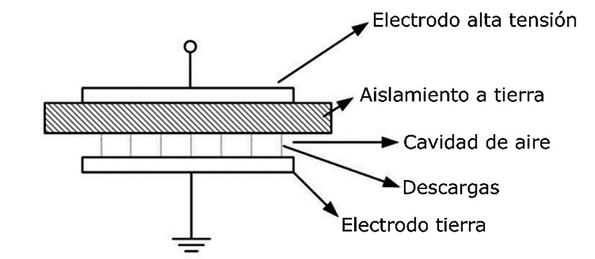 La Fig. 2 muestra el equivalente esquemático de la descarga parcial en la ranura. Este tipo de descarga se da entre dos electrodos separados por un dieléctrico (aislante de barrera) [20].