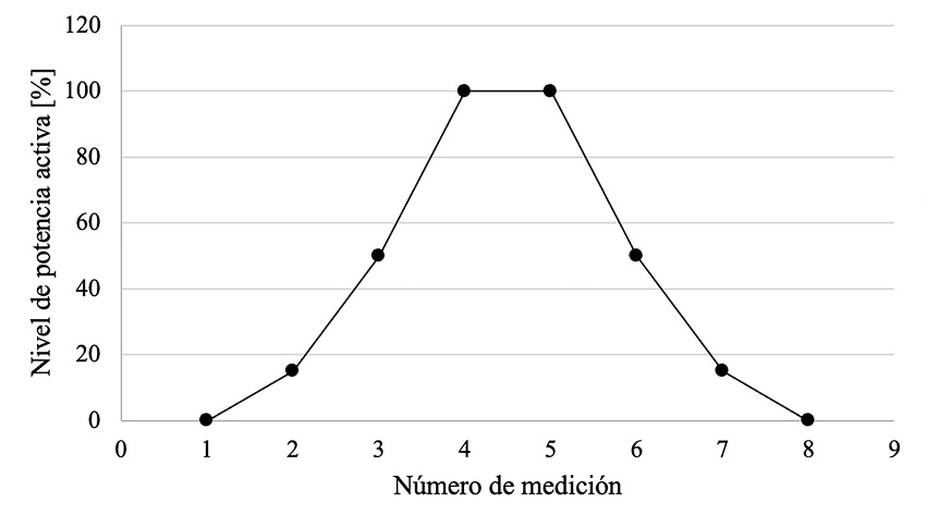 Basándose en lo anterior, se plantea una medición del hidrogenerador en ocho (8) pasos, para distintos niveles de potencia activa, empezando desde el vacío, hasta la máxima potencia, y volviendo a disminuir al nivel de vacío. Este procedimiento considera únicamente la entrega de potencia activa por parte del generador, con un nivel de potencia reactiva bajo. El objetivo de esto es lograr el mayor impacto sobre los cambios de temperatura en los devanados de estator. La Fig. 4 muestra una gráfica secuencial con los ochos pasos en los cuales se realizarán distintas mediciones en porcentaje de máxima potencia activa. Este procedimiento debe ser coordinado con el centro de despacho de energía y el departamento de operación de la central de energía, ya que la unidad en evaluación debe estar enteramente dedicado a la realización de las pruebas.