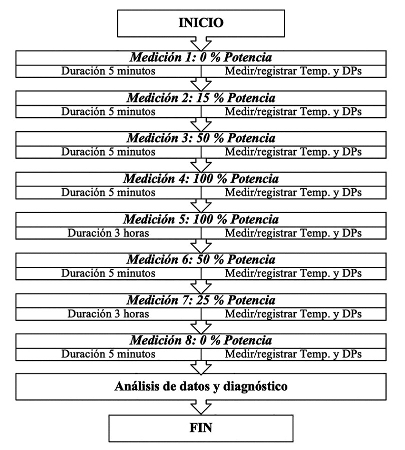 La metodología para la detección de descargas en ranura y debidas a chispas por vibración se basa en la medición de DPs en-línea, realizando cambios en el nivel de carga del hidrogenerador (aumento/disminución). Para desarrollar dicha propuesta se tomó como base la recomendación general que aparece en la norma IEEE 1434-2000 sobre medición de DPs en máquinas rotativas. En la norma indicada, se propone realizar mediciones en-línea de DPs en hidrogeneradores con variaciones de carga. Se busca encontrar relaciones entre el nivel de actividad de DPs con la carga y la temperatura del devanado de estator [12]. Sin embargo, en la norma mencionada, no se establece un procedimiento detallado para llevar a cabo los cambios de carga, establecer la cantidad de pasos, definir el tiempo para la realización de las mediciones, y más bien se dan recomendaciones generales.