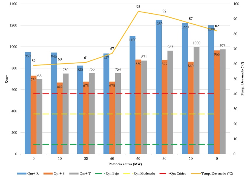 Los datos son registrados para cada fase con los cuales se preparó la Fig. 7, tomando como base los valores límite recomendados por el fabricante del equipo de monitoreo. En primer lugar, la Fig. 7 muestra el efecto que tiene sobre la actividad de DPs frente al cambio de la temperatura a potencia constante. En segundo lugar, se presenta el comportamiento de las DPs ante cambios de potencia a una temperatura constante. La Fig. 7 muestra únicamente el parámetro Qm+ por fase, ya que por tratarse de DPs en ranuras, el patrón típico presenta un predominio de los pulsos positivos [12].