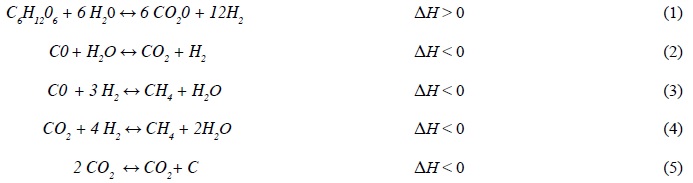 En primer lugar, la glucosa reacciona en los enlaces de tipo C-C en el sitio metálico del catalizador por medio del proceso de reformado de carbohidratos (2.1), donde se obtiene monóxido de carbono (a partir de la descarbonilación del sustrato) y la consecuente producción de dióxido de carbono e hidrógeno como producto de la reacción de desplazamiento de agua-gas (2.2) [1]. Posteriormente, ocurren procesos de hidrogenación y deshidrogenación, descarboxilación, descarbonilación, hidratación y deshidratación, así como reacciones de cambio de agua-gas; esto al producirse una serie de carbohidratos de menor tamaño, los cuales son capaces de pasar por el proceso de reformado en fase acuosa [17].