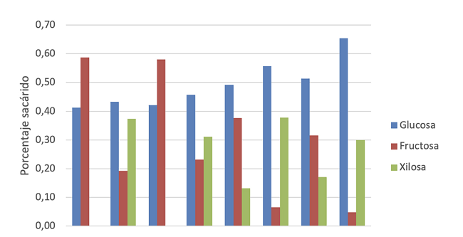Las muestras reciben el procedimiento descrito en la sección anterior. Se prepara una curva de calibración para el HPLC. Se utilizan patrones con dos mezclas de carbohidratos: fructuosa – glucosa y xilosa – arabinosa. Inicialmente, se pesaron 50 mg en una balanza analítica de cada uno de los azúcares y se colocaron en un balón aforado de 5 ml, llevándose a la marca de aforo con agua tipo 1 ultra pura. Seguidamente, se tomaron alícuotas de 1 ml y se colocaron en 5 viales de 2 ml específicos para el uso del cromatógrafo. Se trabajó con un cromatógrafo con columna de intercambio iónico Rezex RCM – Monosaccharide Ca+2, marca Agilent Technologies 1260 Infinity II LC Systems; esta con una fase móvil de agua, con un flujo de 0.4 ml/min. Se estableció como volumen de inyección 3 μL y el método implementado requiere una temperatura de columna y del detector de índice de refracción (RID) de 80 °C y 43 °C, respectivamente.