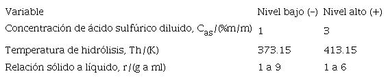 De acuerdo con Azadi, Inderwildi, Farnood y King [21], se considera ácido diluido para uso a nivel de laboratorio, concentraciones de ácido menores a un 10 %m/m de disolución. Asimismo, para la escogencia de los niveles de esta variable se realizó una revisión bibliográfica [22-24], en donde se tomó como punto de referencia que a porcentajes superiores al 10% aumenta la posibilidad de reacciones no deseados, y se requiere de mayor cantidad de reactivos para la neutralización de la disoluciones posteriores para su respectivo pretratamiento; por tanto, se decidió utilizar concentraciones de ácido sulfúrico diluido de 1 %m/m y 3 %m/m