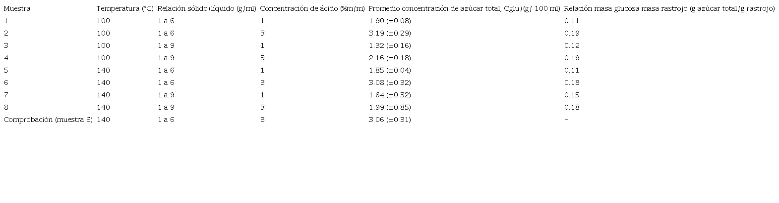 La mejor condición experimental encontrada fue para la temperatura de 140 °C, relación sólido/líquido de 1:6 g/mL, y una concentración de ácido sulfúrico de 3 %m/m. En la Figura 1 se muestran los resultados de promedio de concentración de sacáridos para cada una de las distintas combinaciones del diseño estadístico.