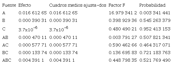La Tabla IV presenta los resultados del análisis estadístico utilizando un nivel de confianza del 95%. Se encontró que la variable significativa en la producción de azúcares totales es la concentración de ácido sulfúrico diluido, que provoca un aumento del 67 % para la producción de azúcares totales producida cuando se aumenta la concentración del nivel menor al mayor.
