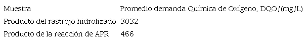 Se determinó el DQO para la fase líquida producto de la hidrólisis ácida y de reformado en fase acuosa, con el fin de establecer en un primer intento, el impacto ambiental que pueda presentar el proceso de producción de hidrógeno. En la Tabla VI se observa como la muestra resultante de la hidrólisis posee un valor 6.5 veces mayor a la muestra después del proceso de reformado en fase acuoso. Los valores producto de la hidrólisis están de acuerdo con lo esperado, ya que se están liberando azúcares, ácidos orgánicos y otro tipo de moléculas pro-ducto de la degradación. Esto además concuerda con la complejidad de la composición la mezcla producto de la hidrólisis.