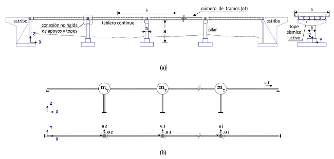 Es común plantear un esquema estructural de puentes con geometría regular de pilares y de conexión no rígida con la subestructura. Para estos casos, el método simplificado propuesto tiene como objetivo establecer expresiones simplificadas como herramienta práctica de diseño sísmico en la industria de puentes de concreto armado. Utilizando estas expresiones se puede calcular los periodos fundamentales de vibración de la estructura y las respuestas sísmicas del pilar más solicitado sísmicamente (en tramos pares se refiere al pilar central, y en tramos impares se refiere a los dos pilares centrales). Además, las expresiones consideran geometrías reales de vigas I tipo AASHTO de concreto presforzado, con base en información recopilada de proyectos diseñados y construidos según las técnicas y requerimientos de las estructuras de concreto postensado.