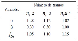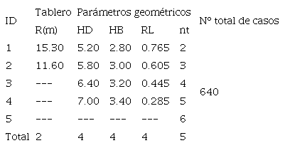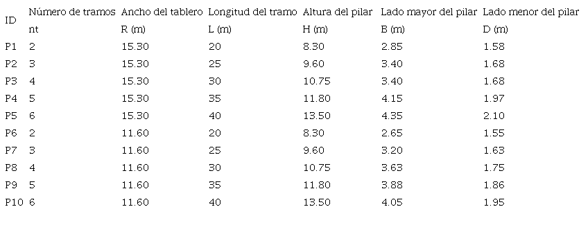 Se asignaron convenientemente valores a los parámetros geométricos de interés (Tabla 2) a partir de valores obtenidos de la relación entre las variables geométricas de un grupo representativo de diez puentes reales mostrados en la Tabla 1. Los parámetros se definieron como: HD - esbeltez longitudinal del pilar H/D, HB - esbeltez transversal del pilar H/B, RL - razón de aspecto en planta de un tramo R/L, nt - número de tramos del puente.