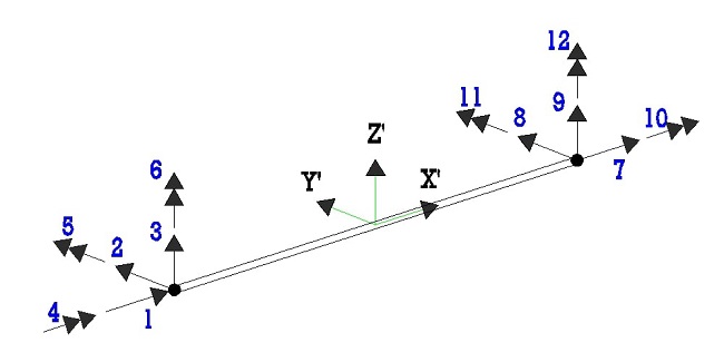 A partir de la matriz de rigidez del elemento tipo viga-columna tridimensional expresado en sus ejes locales (Figura 2) y empleando el criterio de masas concentradas en los extremos. Se elaboró la matriz de rigidez lateral y de masas de la estructura del modelo Ms del puente como se muestra en la Figura 1(b), teniendo en cuenta las condiciones de borde de los pilares y el tablero.
