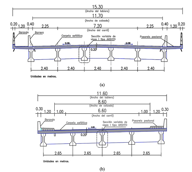 La Tabla 1 muestra las variables y dimensiones de la geometría de un grupo de diez puentes reales con diferentes anchos del tablero (R), la razón entre estas variables permitirá definir un rango de valores para los parámetros geométricos. Los tableros de mayor y menor sección transversal están conformados por cinco y seis vigas respectivamente con distintas geometrías de acuerdo con la longitud de tramo. Además, estos consideran la circulación de dos carriles vehiculares para diferentes anchos de berma, veredas y barandas (Figura 3).