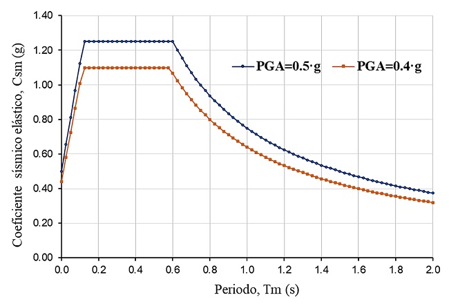 Se emplearon dos valores de la máxima aceleración sísmica del suelo (PGA) como parámetro sísmico para generar los espectros de diseño sísmico elástico, los cuales fueron elaborados de acuerdo con la metodología de construcción de espectros de diseño [7] y el mapa de isoaceleraciones proporcionado por el Manuel de Puentes [10].