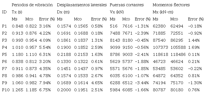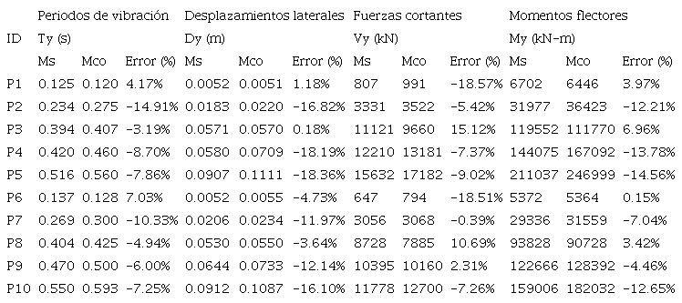 Los errores máximos absolutos fueron del orden de 10.33% en el cálculo de periodos fundamentales de vibración, 18.36% en los desplazamientos laterales máximos de pilares, 18.57% y 14.56% para las fuerzas cortantes y los momentos flectores en la base del pilar. Desde el punto de vista ingenieril y para propósitos estimativos, estos errores son considerados aceptables por ser menores a 20%.