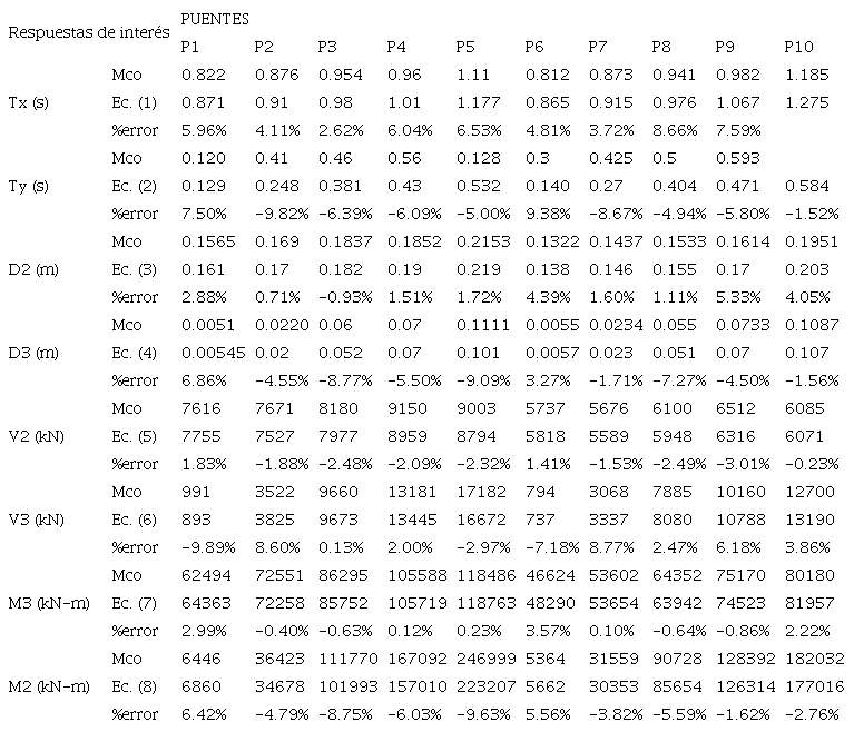 Finalmente, se obtuvieron expresiones simplificadas para estimar la respuesta sísmica de puentes carreteros de geometría regular de cualquier longitud, en dos direcciones de análisis. Las respuestas de interés elegidas fueron el periodo fundamental de vibración de la estructura, el desplazamiento lateral, la fuerza cortante, y el momento flector del pilar con mayor demanda sísmica. Los resultados del método simplificado permiten obtener un diseño sísmico preliminar de la estructura de manera rápida y confiable [1].