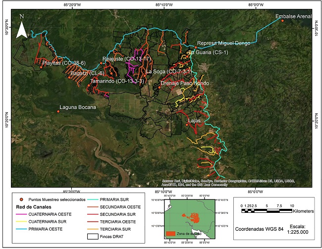 En el complejo hidroeléctrico Arenal-Corobicí-Sandillal (ARCOSA) se localiza el Embalse Arenal, punto inicial de muestreo del DRAT. Las aguas son transportadas a tres casas de máquinas para la generación de energía, no son consideradas aguas residuales ordinarias, ni especiales; pues pasan por unidades turbogeneradoras sin provocar contaminación. Posteriormente, son conducidas hasta la presa derivadora Miguel Pablo Dengo Benavides (MPDB), donde se distribuyen a la red de canales. Esta red está conformada por el canal principal del Sur y el canal del Oeste, que se extienden por 8,5 y 21,9 km respectivamente [24]. De ambos canales se despliegan derivaciones secundarias y terciarias, con una red de infraestructura hidroagrícola que incluye 255 km de canales de riego y 163 km de canales de drenaje como se presenta en la Figura 1.