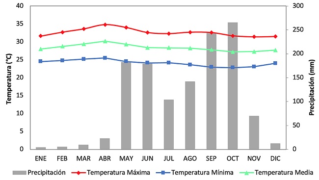 Presenta un clima tropical seco al ubicarse dentro del Corredor Seco Centroamericano. Según datos de la estación Hacienda Mojica del Instituto Meteorológico Nacional (IMN) [23], el régimen de precipitación predominantemente va de mayo a noviembre presentando las mayores precipitaciones en los meses de octubre y setiembre con valores de 265,5 mm y 244,1 mm respectivamente (Figura 2). La estación Hacienda Mojica está localizada a 10° 26´59” Norte y 85°10´ Oeste, a una altitud de 33 m.s.n.m. Las temperaturas máximas se presentan entre los meses de febrero a mayo con máximas promedio de 34,8°C en el mes de abril, una temperatura media de 30,2°C y mínima de 25,5 °C para el mismo mes.