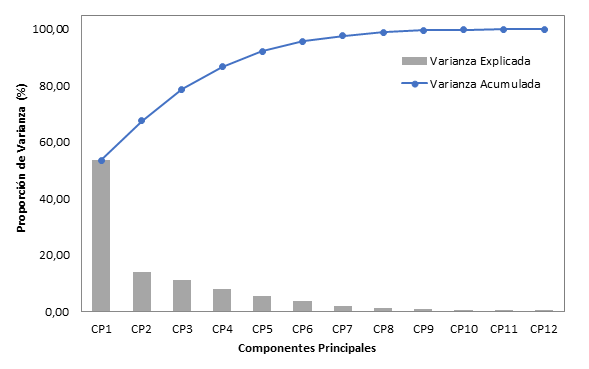 En la Figura 3 se muestra la varianza asociada al primer componente que explica el 53,68 %, el segundo el 13,98 % y el tercero el 11,03 %, para en conjunto describir el 78,68 % del comportamiento de la calidad del agua de vertido del DRAT. Se decide trabajar con estos tres componentes, pues la varianza acumulada es cercana al estándar del 80% [37]. Para los tres primeros componentes principales se obtienen autovalores de 11,81; 3,07 y 2,43 respectivamente; todos por encima del promedio del valor de uno de la matriz de correlación.