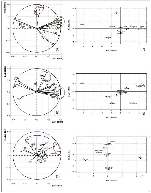 En el tercer componente principal (CP3) se agrupan la temperatura (T), la demanda bioquímica de oxígeno (DBO), coliformes totales (CT) y la saturación de oxígeno (SO). En conjunto se pueden relacionar con la dinámica biológica, estas variables se vinculan con la presencia de oxígeno en las aguas necesario para el desarrollo de la vida acuática, incluyendo la presencia de microorganismos que consumen oxígeno para oxidar el material orgánico. El CP3 se ubica en las Figura 4.c y Figura 4.e en el eje de las “y”, donde las variables que más se correlacionan con este componente, se ubican en ambos casos en la parte superior (color azul).