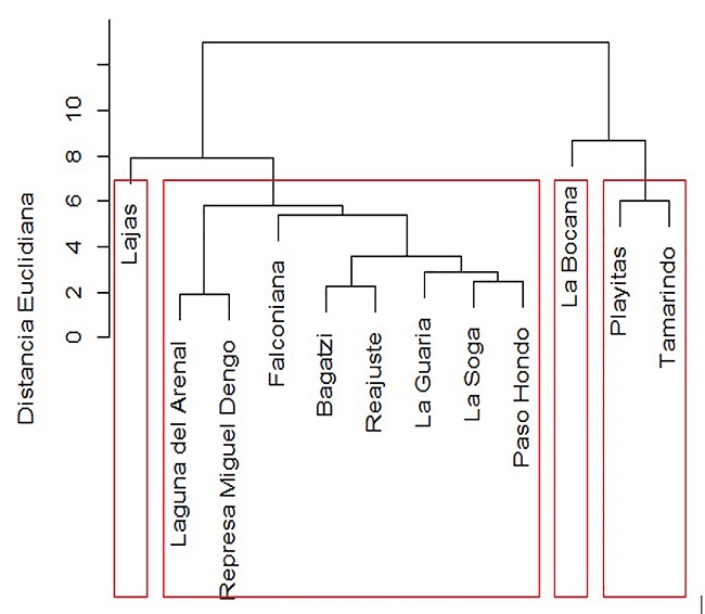 Se manejó la totalidad de los datos para el análisis de conglomerados jerárquicos o clústers (AC), utilizando la distancia euclidiana para los puntos de muestreo, permitiendo la identificación del agrupamiento natural con base en las similitudes. La información obtenida, fue empleada para la clasificación de los grupos para el análisis de discriminante (AD); aplicando el procedimiento estandarizado y la validación cruzada para estimar la tasa de error.