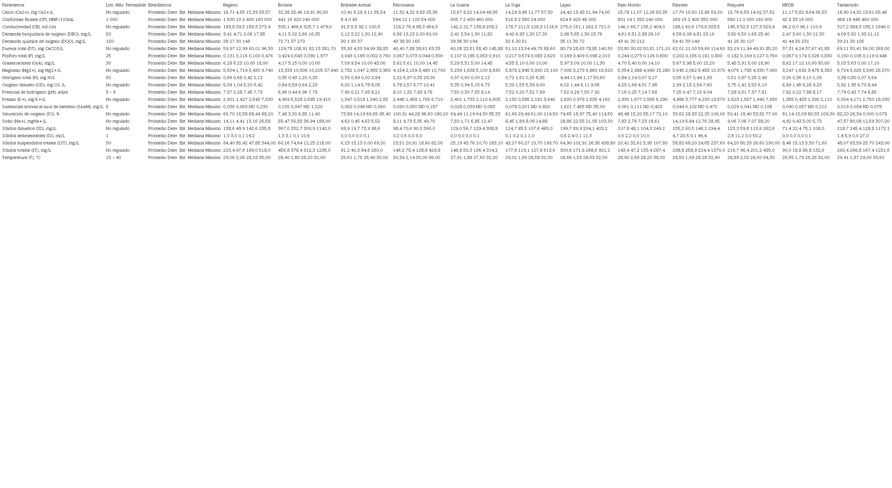 Para la estadística descriptiva se calculó el promedio, la desviación estándar, la mediana y el máximo valor reportado. Para los coliformes fecales y totales se calculó el promedio geométrico y la desviación estándar geométrica, que se aplica en estudios de crecimiento bacteriológico, que presentan comportamientos logarítmicos. Los resultados fueron comparados con los valores máximos permitidos según el DE-33601-MINAE-S [26], que se muestran en la segunda columna de la Tabla 1. Algunos de los parámetros en estudio no se encuentran normados en Costa Rica, sin embargo, se cuantifican para un adecuado monitoreo del distrito de riego.