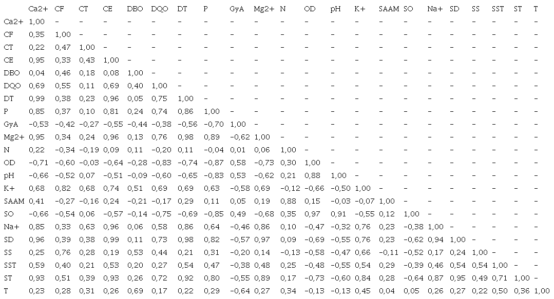El ACP llevado a cabo demuestra que algunas variables están estrechamente relacionadas entre ellas como: la dureza total que encierra los iones de calcio y de magnesio; la determinación de oxígeno disuelto y la saturación de oxígeno; los sólidos disueltos y totales con la conductividad eléctrica. De tal forma que podrían eliminarse algunas de las mencionadas, porque brindan información redundante y no son parámetros obligatorios según DE301-MINAE-S.