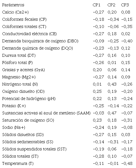 En la Tabla 3 se exponen los resultados de los autovectores normalizados y se aprecia que las variables con los coeficientes más altos para el primer componente principal (CP1) corresponden a sólidos totales, sólidos disueltos, dureza total, magnesio, calcio y conductividad, que pueden ser interpretados como la concentración de sales o sólidos disueltos presentes en las aguas.