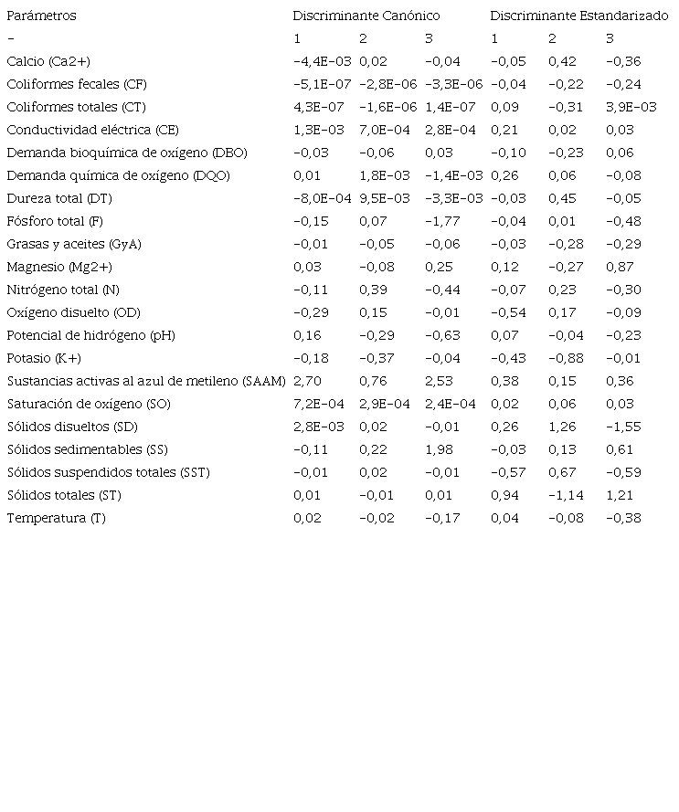 En la función discriminante canónica propuesta en la Tabla 4 con las 22 variables, los coeficientes responden a las distribuciones de cada variable. En este estudio las variables tienen varianzas muy distintas, siendo más apropiado la aplicación de la función discriminante estandarizada por las covarianzas comunes (Tabla 4). Donde se aprecia que los sólidos totales y los disueltos son los parámetros que más inciden en la separación de grupos, mostrando concordancia con los resultados del primer componente principal del ACP.