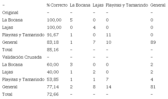 La Tabla 5 muestra que los datos originales son correctamente clasificados en un 85,16 %, donde la distribución de errores no es uniforme, presentándose el mayor número de casos mal categorizados en el grupo general; que corresponde al de mayor tamaño; que podría mejorarse con una variación del punto de corte a partir de un análisis de probabilidades. Mientras que en el método de validación cruzada se observa que la tasa de clasificación correcta disminuye en todos los grupos, para alcanzar un total de 72,66 %. Demostrando que las funciones de clasificación para futuras muestras se estimarían con una evaluación más realista del modelo.