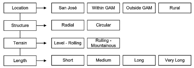 Figura 1 shows the summary of the classification method described above. Location is the firstparameter for grouping the routes, then each unit is assorted to a different category according toits characteristics from the subsequent three levels. For example, one of the final groups consistsof the units of San José, with radial structure, level – rolling terrain and short length. Not everypossible combination was defined as a group, each category was evaluated by size and relevanceto decrease the total number of groups.