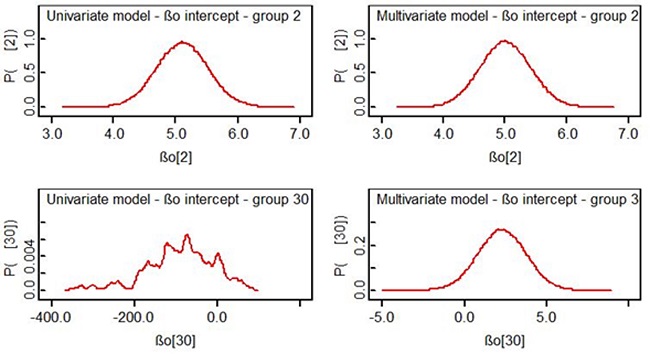 The estimated kernel density of the posterior distribution of the parameters further shows the benefits of random coefficients models over univariate models. The estimated density of \beta_0 for the groups with the largest and the smallest sample size are presented in Figure 2. The density in group 2, with a sample size of 90, shows almost no changes between the univariate and the multivariate model. On the other hand, the density in Group 30, with a sample size of 3, shows how by considering the population and not just the within-group variation sample, the multivariate model improves the model prediction compared to the univariate model, particularly for groups with small samples.