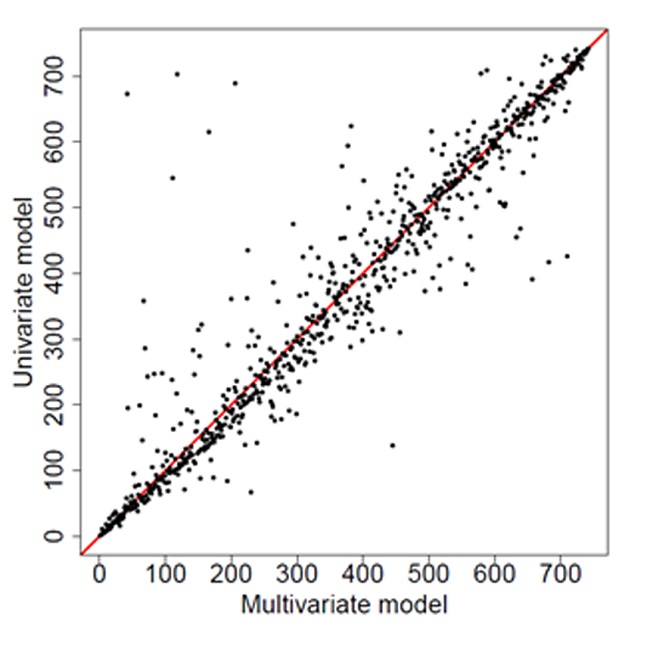 Figure 3 makes a comparison between both model rankings around the unitary diagonal, showing that the models present slight differences in the deltas ranking, as a considerable number of points are close to the diagonal; nevertheless, several values, specifically those of lower ranking for the univariate model are far from the unitary reference.