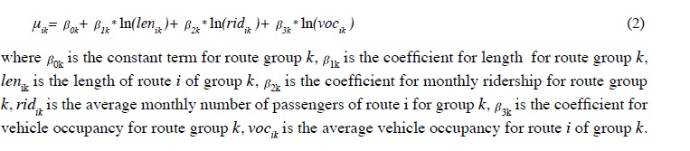 In order to avoid the biases due to analyzing systems with different sizes and operating environments, Karlaftis and McCarthy [16] used cluster analysis to classify 256 transit systems into homogenous groups. The 742 routes used in this analysis required a similar grouping in order to improve model performance. For regression of clustered data, random coefficients models are usually considered, as they control for between-cluster variation [17].