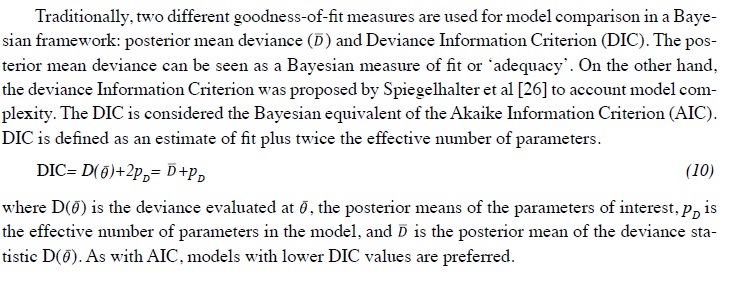 The goodness-of-fit measures commonly used in full Bayesian statistics are presented in thetable: the posterior mean of the deviance and the deviance information criterion (DIC)[26]. The deviance is estimated in the same way for frequentist and Bayesian statistics, while the DIC is the Bayesian equivalent of the Akaike information criterion. As in the case of their frequentist counterparts, the deviance and the DIC quantify the relative goodness-of-fit of the models; therefore, they are useful for comparing models.