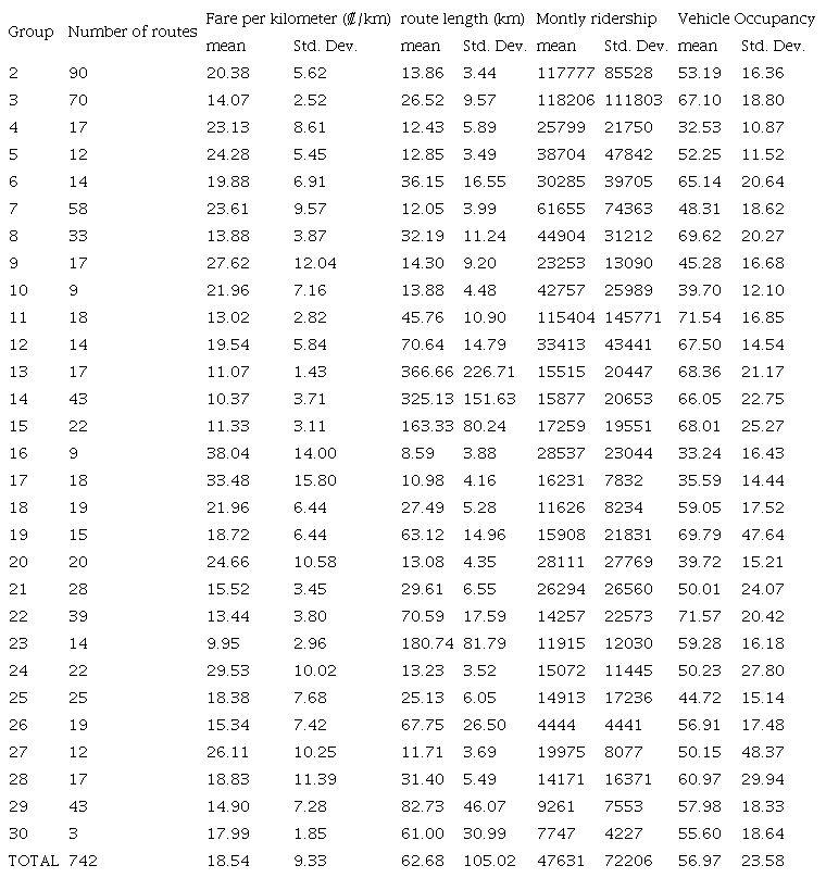 From the summary statistics in Tabla 1, it is observed that monthly ridership has high dispersion, since the standard deviations are higher than the mean frequencies for many of the groups and the total routes. The bus route length also presented high dispersion on the aggregated statistics but the dispersion inside each group is significantly reduced. This was expected since the route length was one of the criteria used to create the groups. The fare per kilometer and the vehicle occupancy presented small variance both at the aggregated level and at the group level.