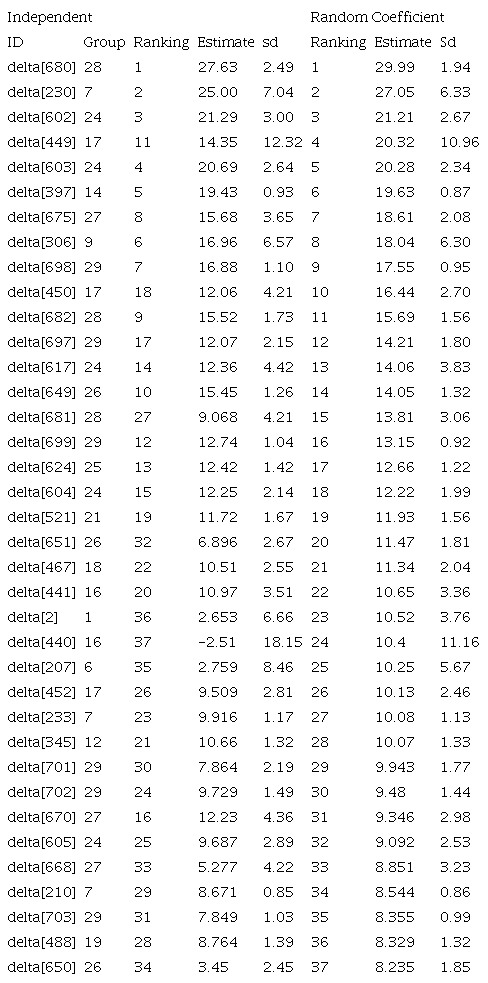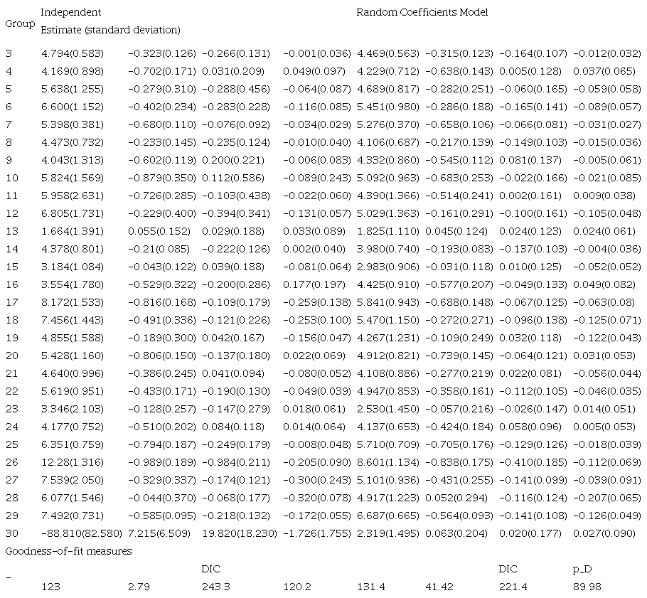 From Table 2it is observed that the estimates for groups 13, 23 and 30 are not significant. Even though, these categories have a small sample size (17, 14 and 3 respectively) the groups 1, 10 and 15 have also small sample sizes (5, 9, and 22 respectively) but they return one or more significant variables. The random coefficients model, as mentioned before, has a stronger influence in reducing the small sample groups mean and standard deviation.