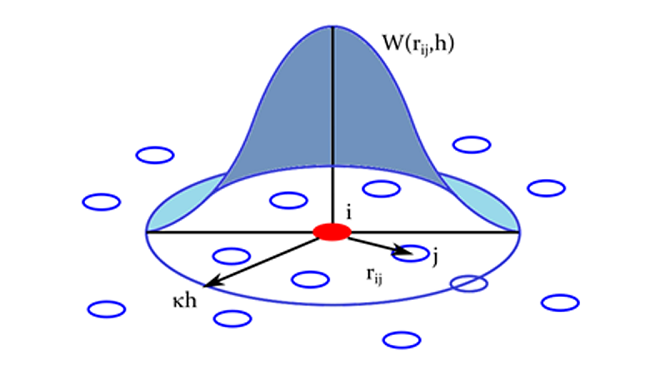 The smoothed particle hydrodynamics (SPH) approach is a meshless discrete method where the volume of fluid is divided into a finite number of particles, usually uniform in size and nature. As with any other Lagrangian approach to discretization, since the particles are not fixed in space, their movement is modelled with the fluid dynamics equations for conservation of mass and conservation of momentum [7]. Any other applicable equations required to model the physical state of the fluid (changes in density, viscosity, temperature, for example) must, of course, be considered as well. The main difference of the SPH method in comparison with Newtonian particle methods1, such as the Multiple Particle Method (MPM) and Particle In Cell (PIC) method [8], is that any single particle interacts both with immediately adjacent neighbors and those within a spatial radius equal to khas shown in Figure 1.