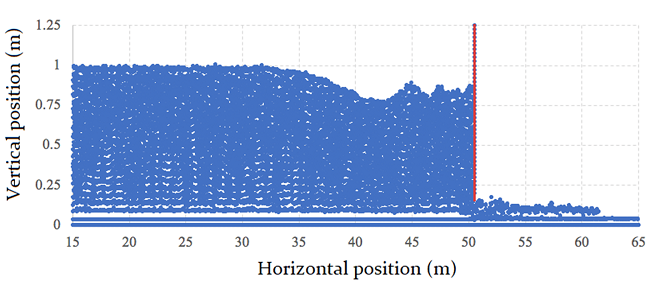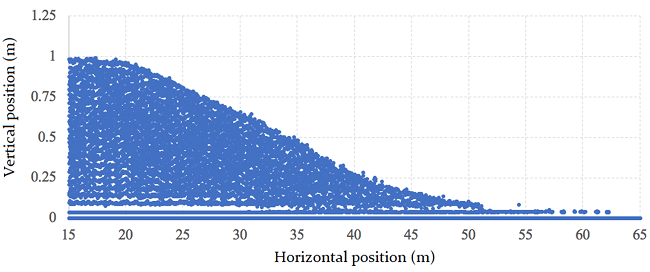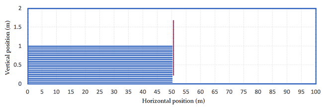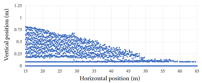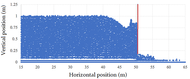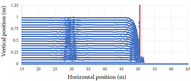 In these images, it is very important to keep in mind the nature of the model, which is of a high (1:50) aspect ratio; as such, there is correspondingly high graphical distortion in the vertical scale in relation to the horizontal scale. Some particles may appear overlapping, but this is not a particle penetration problem, it is only a consequence of the high horizontal density of the plot, necessary to show such a long model in a single graph.
