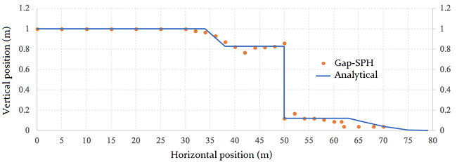A comparison with the analytical solution for this dataset is shown in Figure 9 where there is a good degree of correspondence (2.8 % RMS relative error to full channel depth for the model between 30 m < x < 60 m, with a maximum error of -7.1 % at x = 42 m) except for the area with only one layer of particles available to model the water front (occurring between 62 m < x < 80 m at t = 5.0 s). As in the low-resolution dam break case with 3 500 particles, there are not enough numerical energy transferal processes between particles to properly model the continuum. The error in that area is large, both in qualitative and quantitative terms, and part of the reason is because of the virtual particle equations that model the boundary through a strong repulsive force. Since this ends up being a series of particles in a line, there is not much of a chance of energy transfer thorough viscous shear stress or the increment of local density which would in turn contribute to local pressure through the equation of state.
