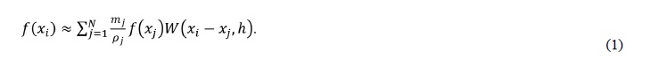 Since the central challenge for solving the fluid mechanics equations is obtaining the value f(xi) of the dynamic and physical variables pertaining to the state of the flow, the SPH method approximates them through a numerical scheme known as the particle approximation[7]. The general statement is that for a particle i, located at position xi an approximation of f(xi) can be calculated as a weighted average of the value of f(x)for all N neighboring particles using (1), which can be readily transformed to computational source code: