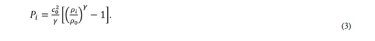 The usual terms for fluid flow are: the speed vector u, pressure P, viscosity m, plane strain rate tensor \epsilon^{xy}, and density \rho. However, particle approximation produces additional terms which include particle mass m, a second appearance of density \rho and partial derivatives of the smoothing function. The reason to mention this equation here, aside from its importance, is that the multiplied density terms \rho_i\rho_jnot only affect the value of acceleration or any other variable through (1) but also drive the variations. In the case of the weakly compressible SPH method (WSPH), this is due to the form of the equation of state, that gives the fluid an artificial compressibility to correlate the variation of pressure as a function of local density \rho_i. In this study, (3) was used and is known as the Monaghan equation [7]for local effective pressure affecting particle i: